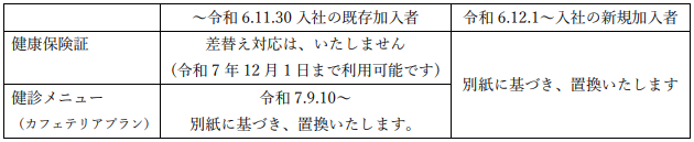 令和6年12月1日以降、当組合からお送りする各種証、通知書、証明書等の全てにおいて、置換文字(該当の置換文字がない場合は、アルファベットまたはカタカナ)での対応となります。なお、健康保険証および健診メニュー(カフェテリアプラン)については、以下の通りです。