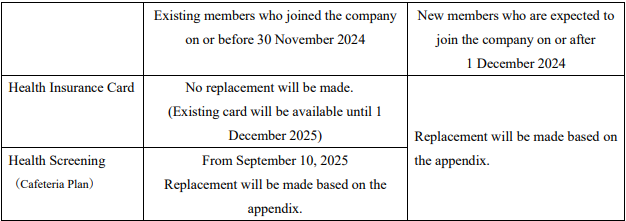 We will apply alternative characters (if no suitable alternative is available, alphabet or Katakana will be applied) for all the documents, notifications and certificates which will be sent from the Association on or after December 1st 2024. Planned actions for health insurance cards and health screenings (Cafeteria Plan) are as follows;